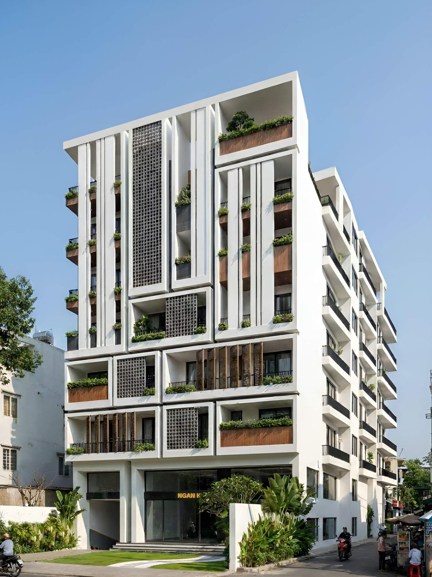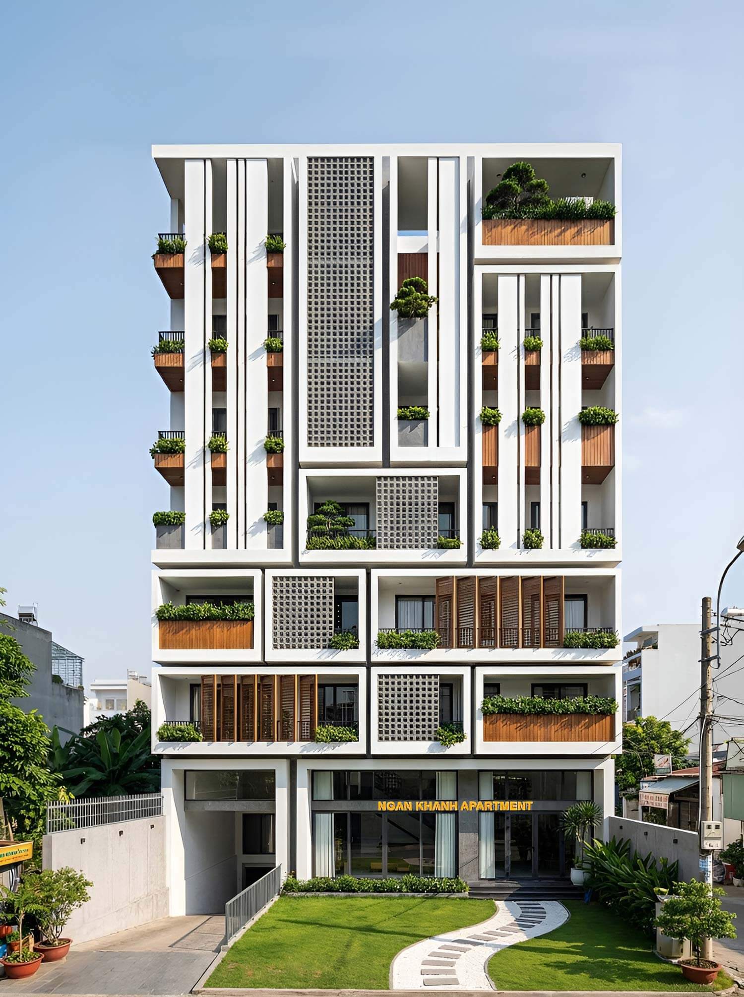 Căn hộ được bố trí rất nhiều ban công ở mọi tầng giúp không gian trở nên rất thoáng đãng. Đặc biệt hiệu ứng của khối lam được thiết kế bằng gạch bông gió ở các tầng đầy nhịp điệu vừa giúp công trình trông nhẹ nhàng thẩm mỹ vừa tạo không gian mát mẻ, che nắng hiệu quả, nhận gió ánh sáng tự nhiên lùa vào các tầng