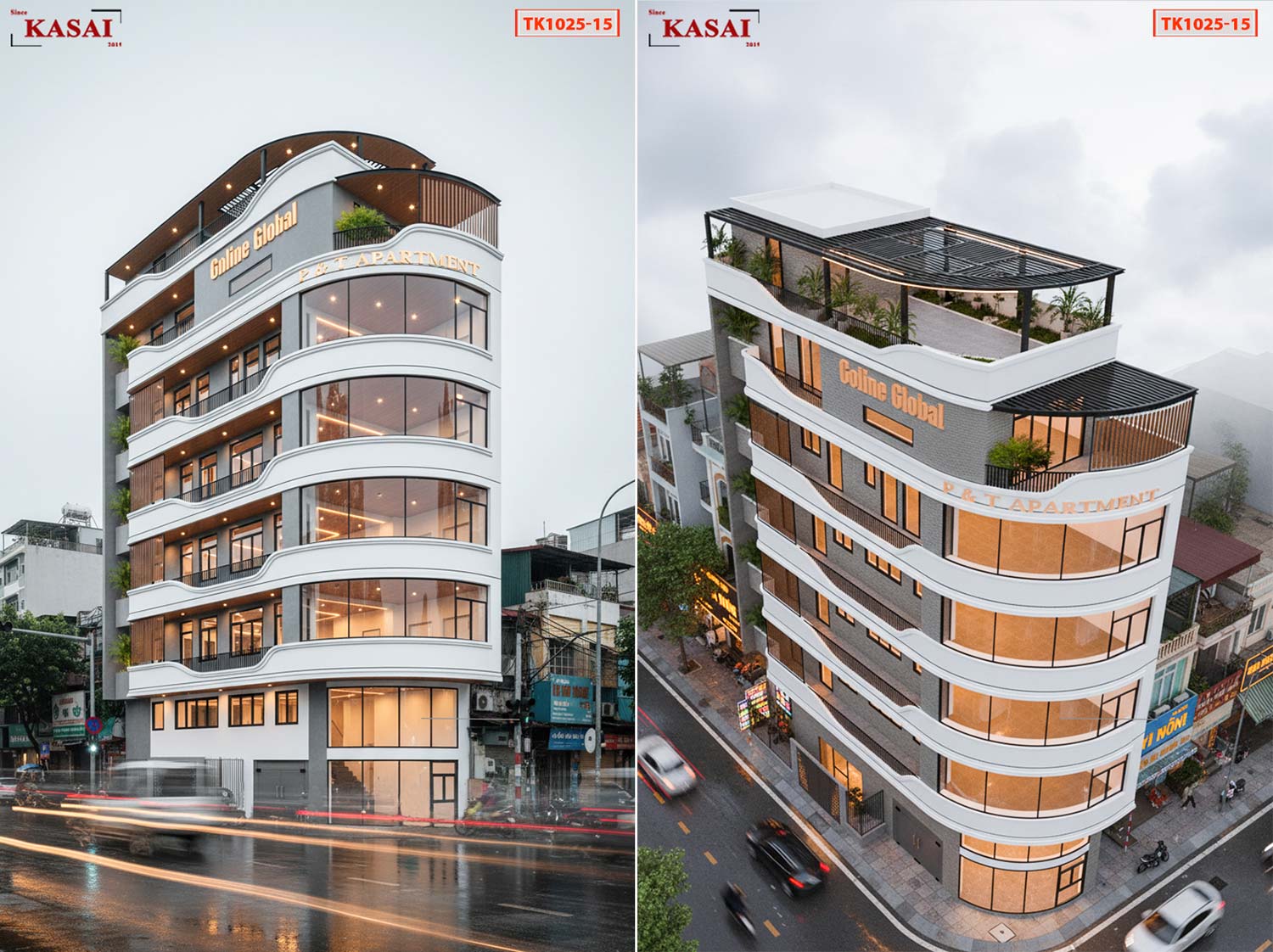 Mẫu căn hộ 7 tầng 1 tum nổi bật giữa phố với thiết kế siêu hiện đại tạo không gian sống cực đẳng cấp. Mặt tiền sang trọng, nội thất tinh tế và tiện nghi mang đến sự thuận tiện nhất khi sinh sống trong các căn hộ tại đây. Cùng xem chi tiết thiết kế Apartment cho thuê 7 tầng 1tum bên dưới và liên hệ KASAI để được tư vấn thiết kế nếu có nhu cầu nhé!