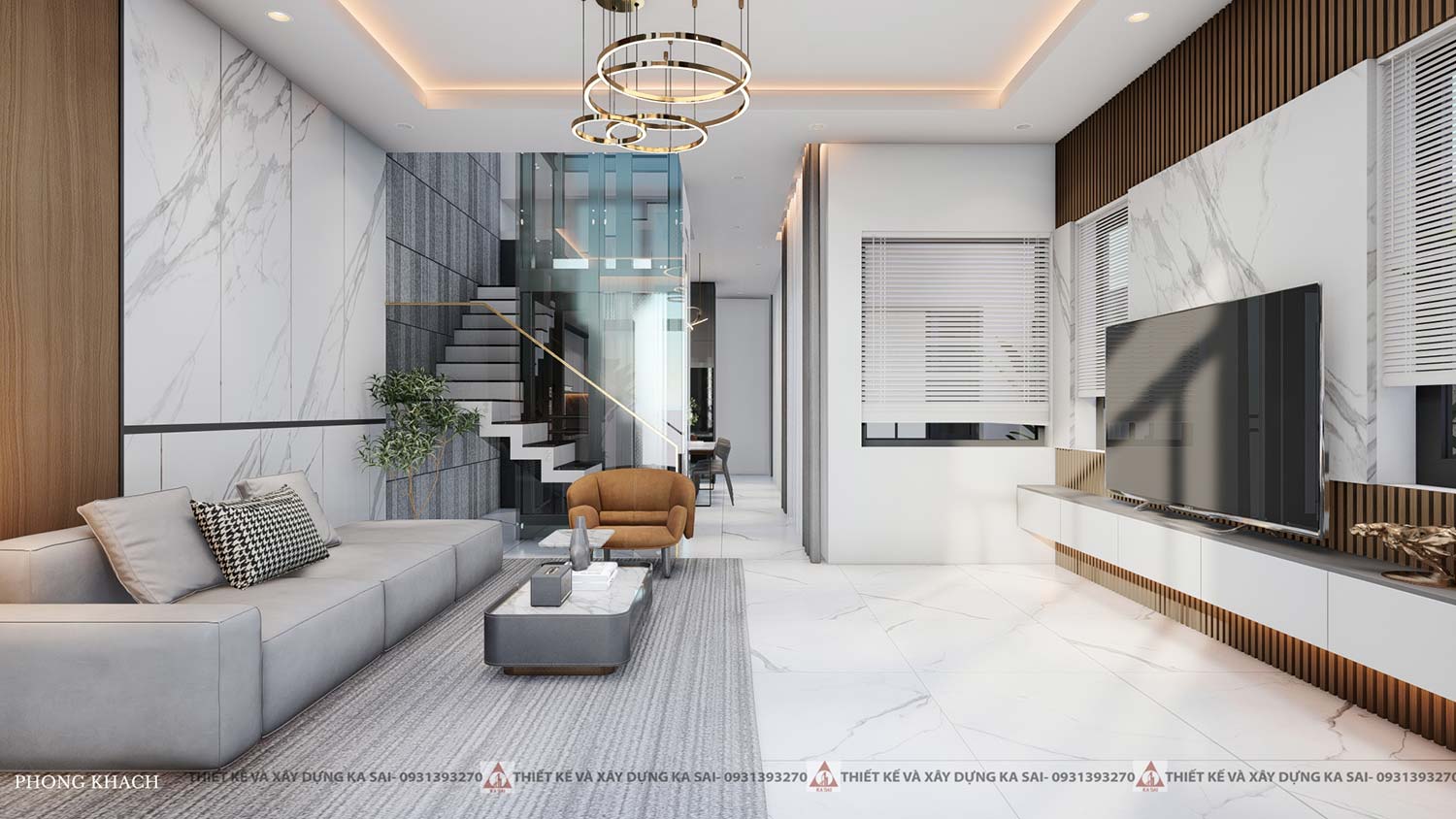Trong biệt thự không gian sống được thiết kế theo phong cách hiện đại tối giản với tone màu trắng xám hiện đại sang trọng. Gia chủ chắc chắn sẽ có được những khoảng thời gian sống thật thoải mái và tận hưởng.