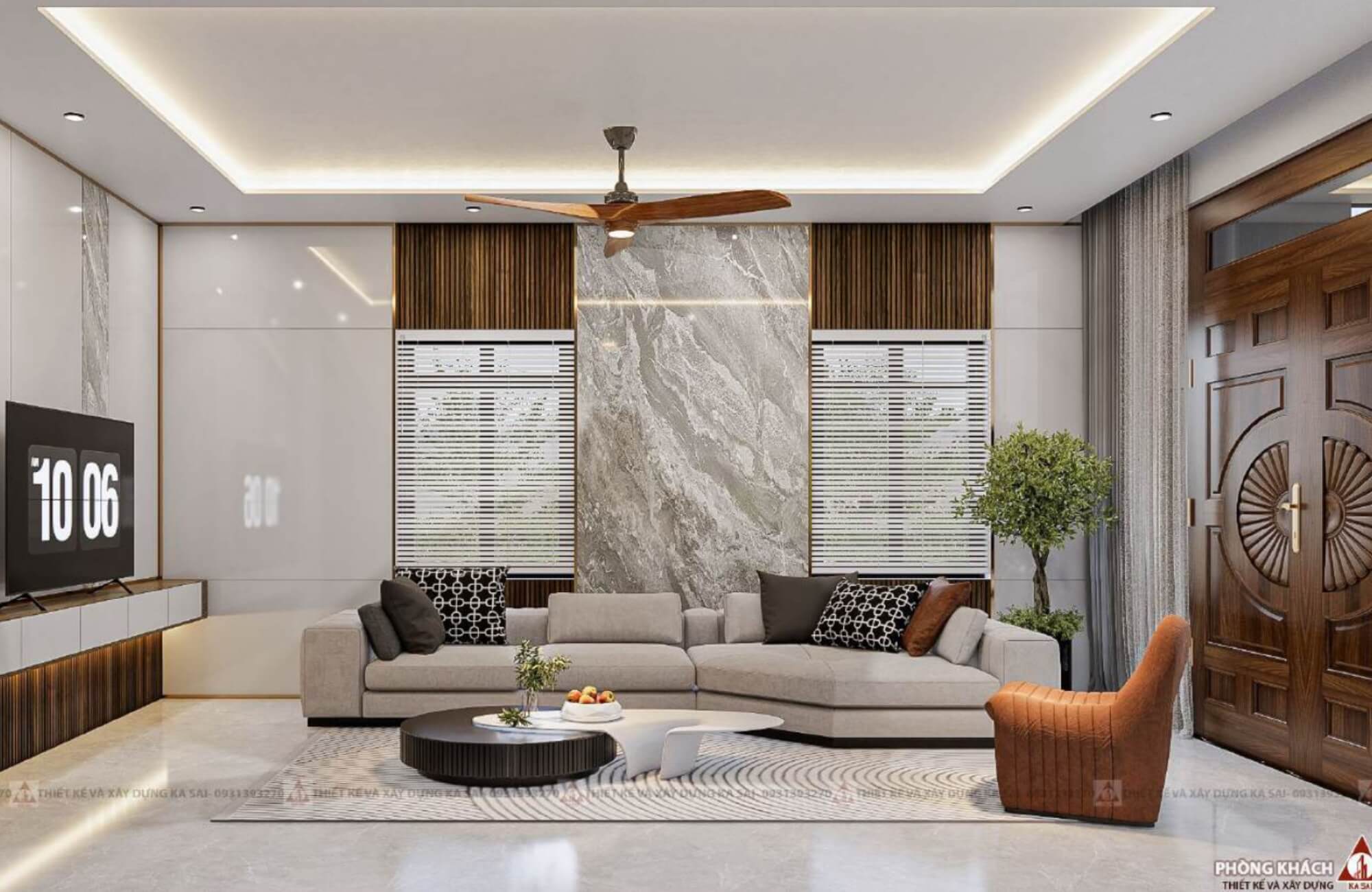 Phòng khách rộng rãi với mảng tường ốp đá trưansg, xám cực sang