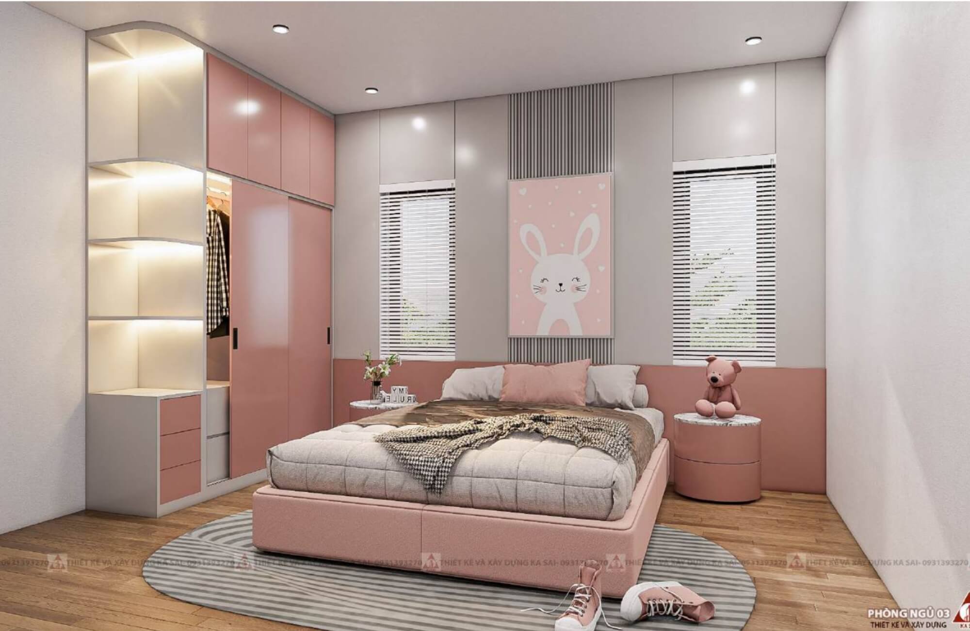 Phòng ngủ 3 cho trẻ em dùng tone màu trắng hồng cực xinh xắn