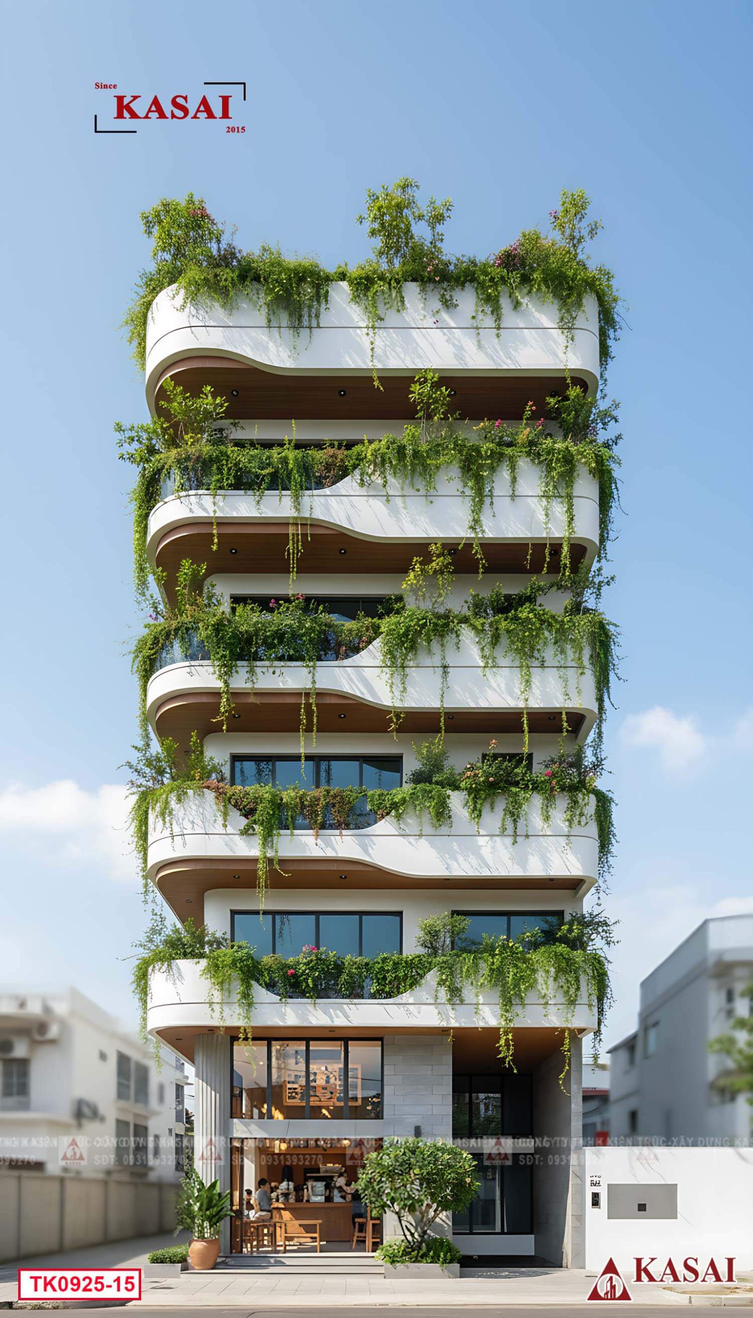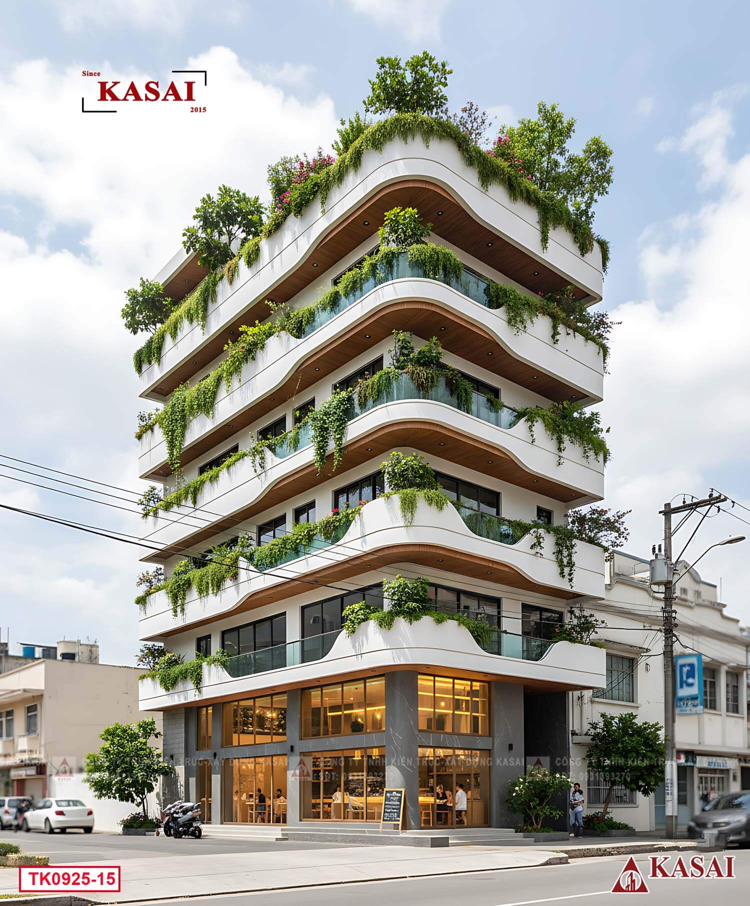 Tòa nhà được thiết kế nơi góc phố nên cực chú ý về mặt tiền, bố cục.  Tòa nhà được thiết kế với phong cách hiện đại, sử dụng những đường bo cong sóng lượn trên mặt tiền cực kỳ thu hút, tạo cảm giác nhịp điệu cho căn nhà. Những hàng cây xanh được bố trí ở ban công giúp cho căn nhà trên phần mát mẻ, xanh mát.