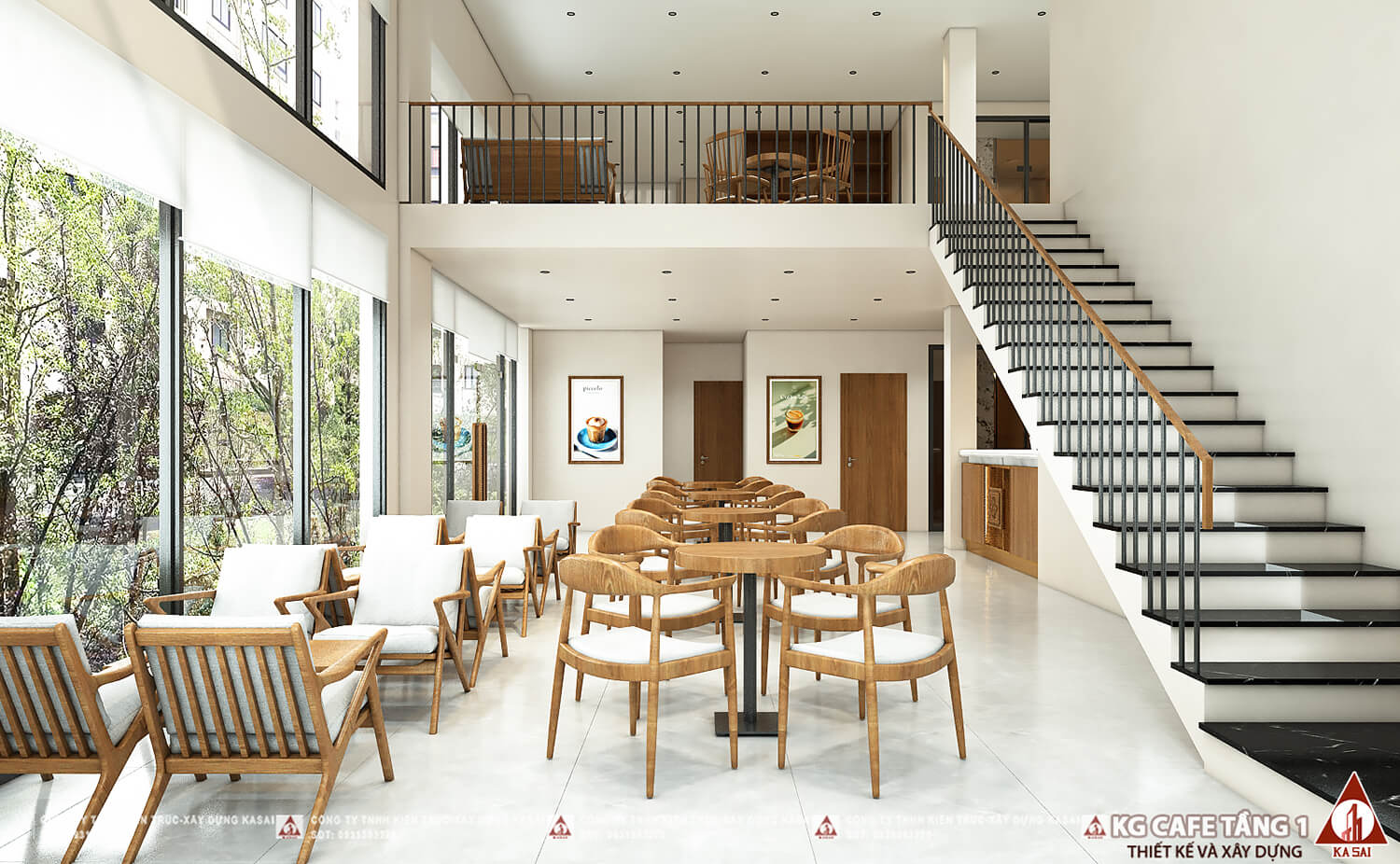 Quán cà phê thiết kế rộng rãi với tầng lửng phía trên