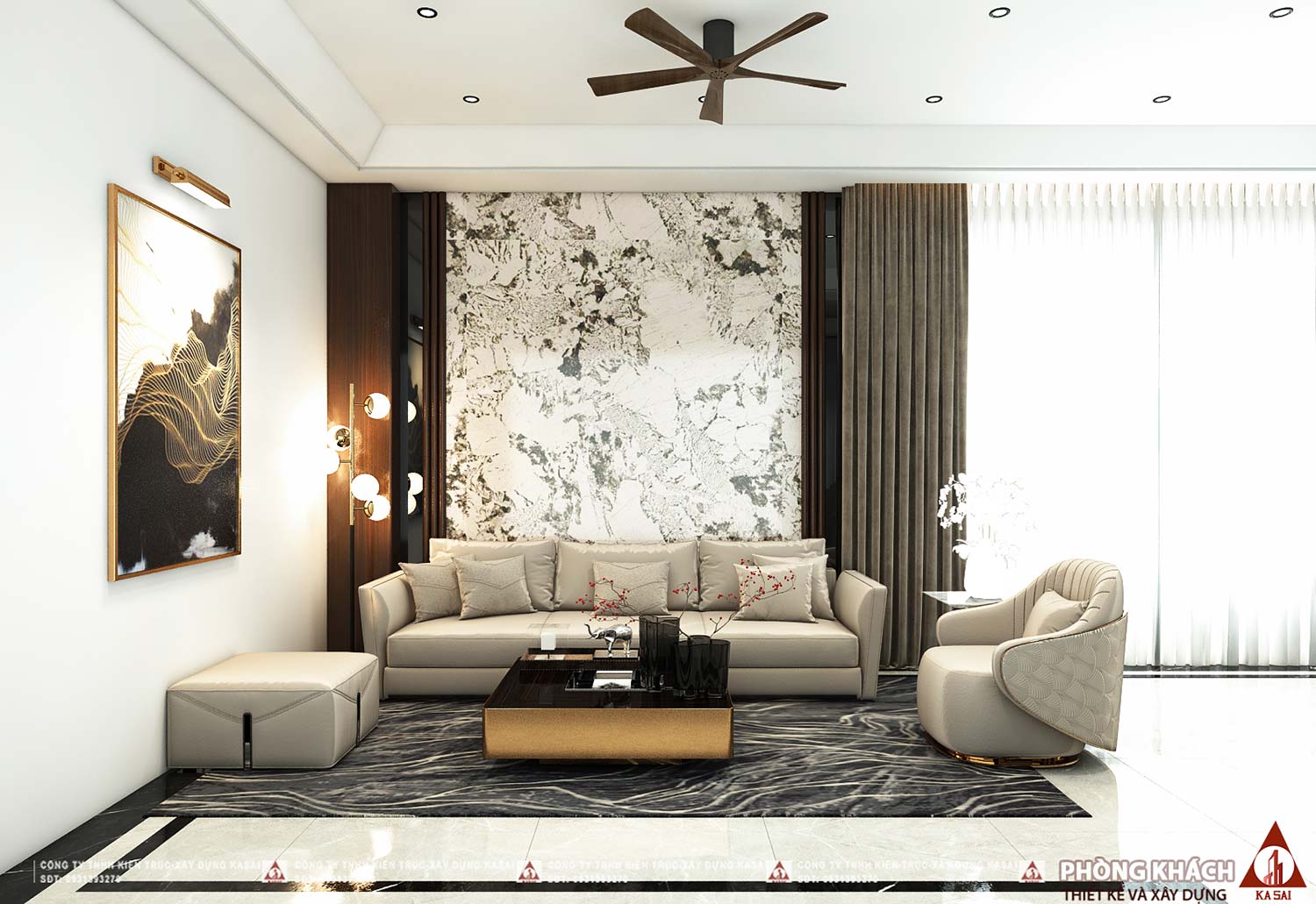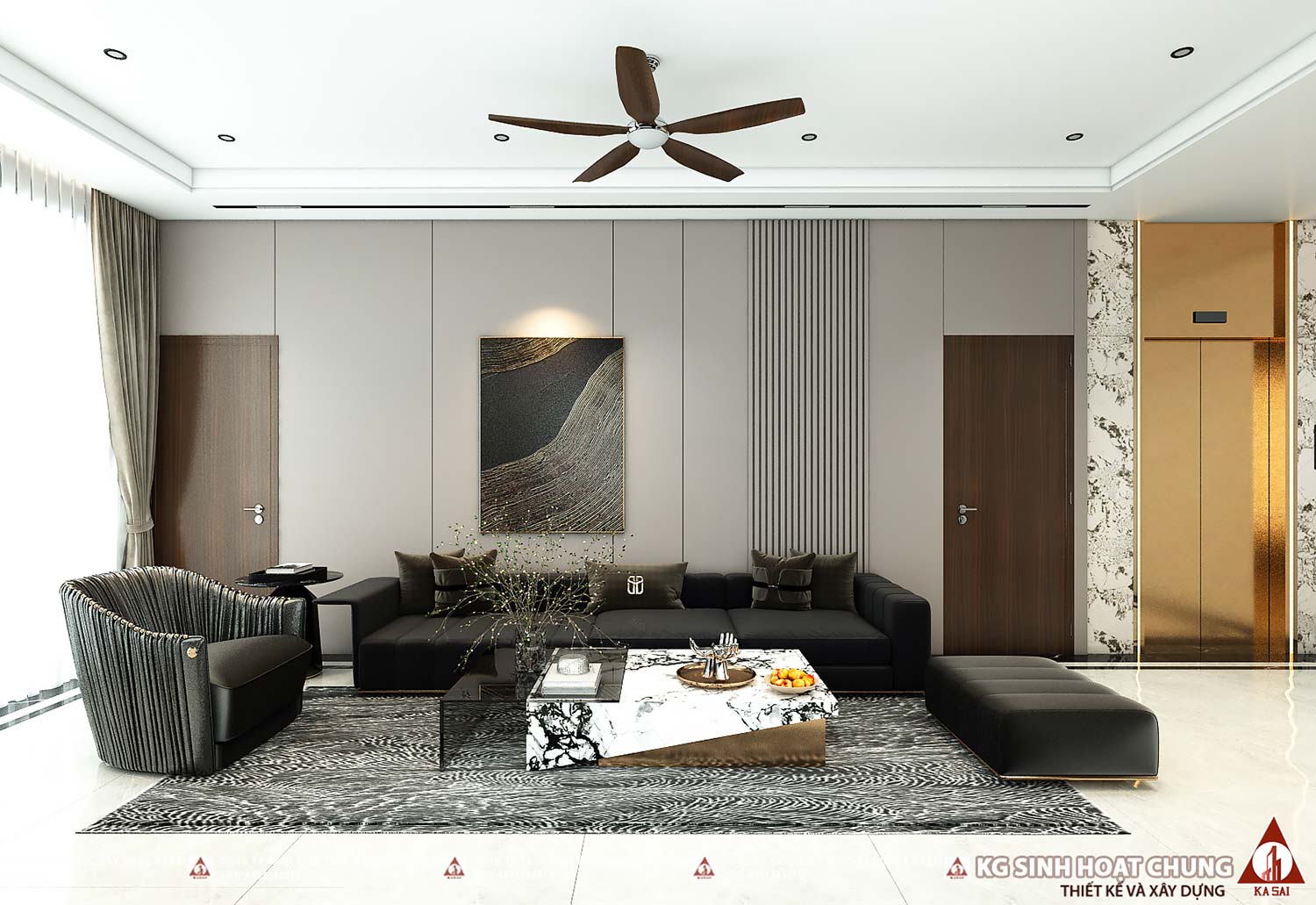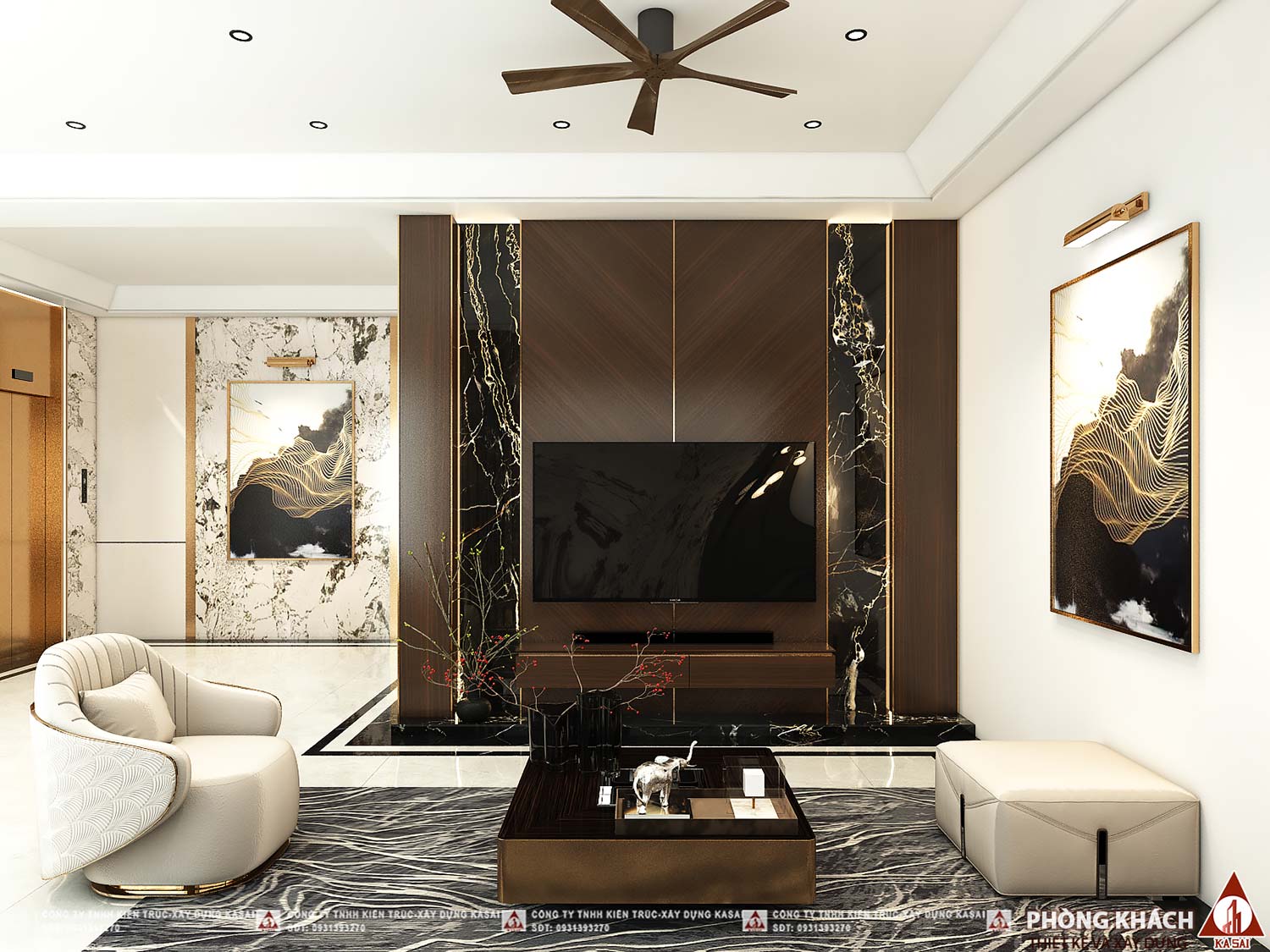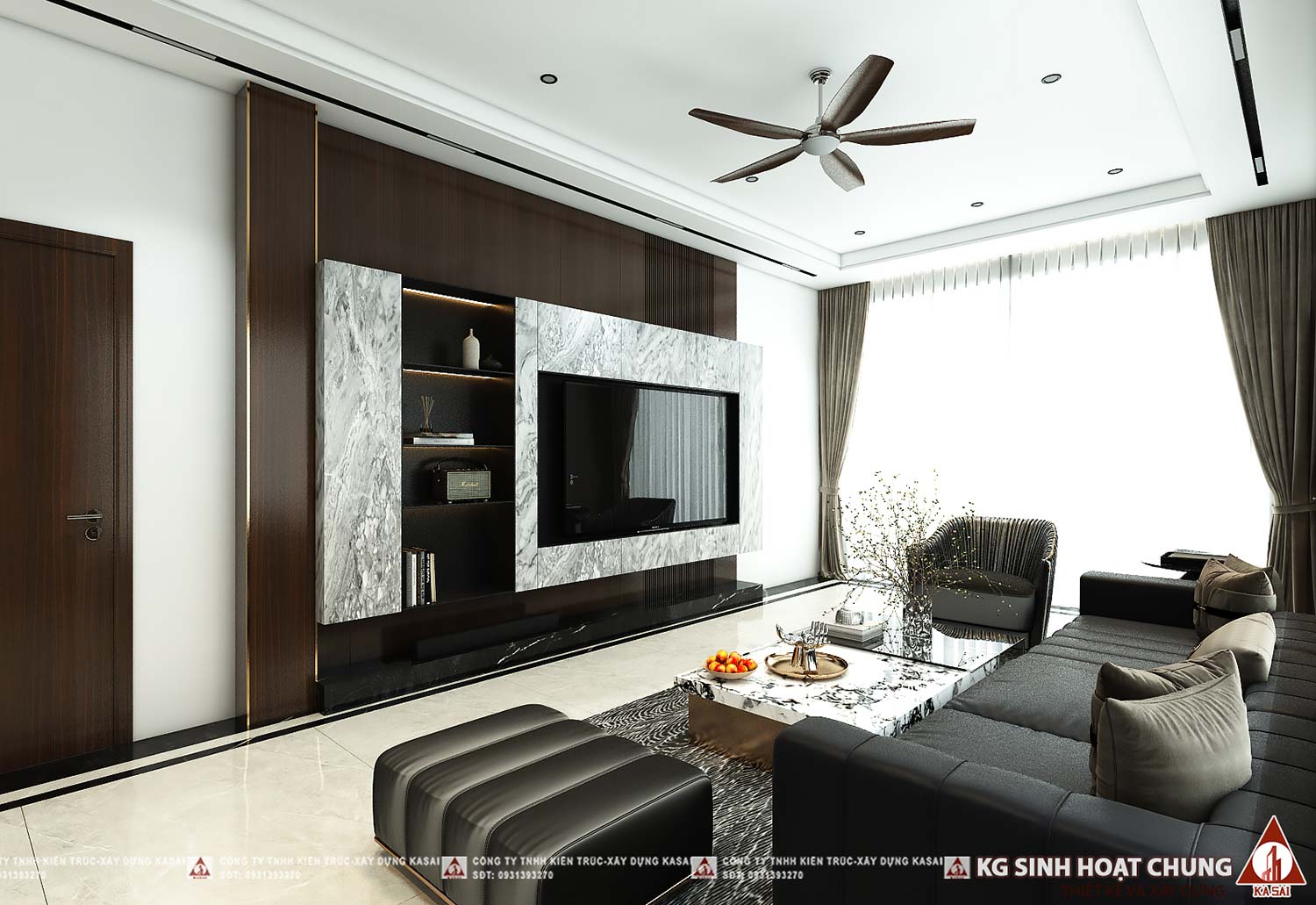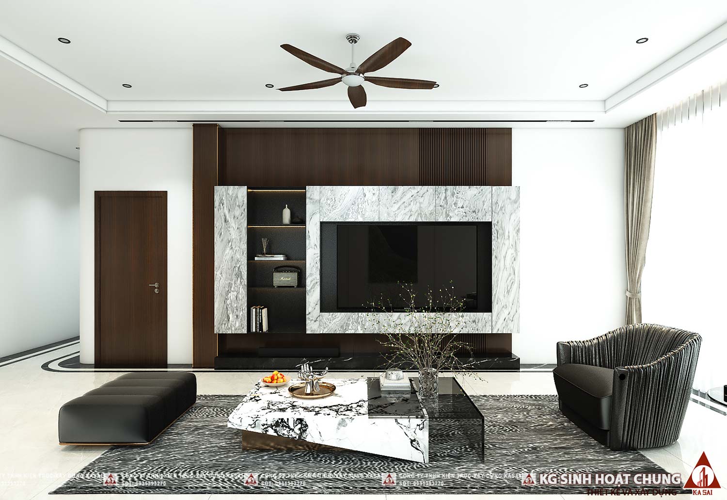 Khu vực sinh hoạt chung được bố trí sang trọng với mảng tường ốp đá, lam gỗ