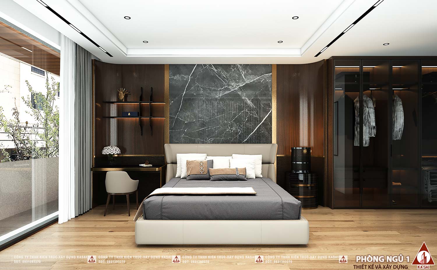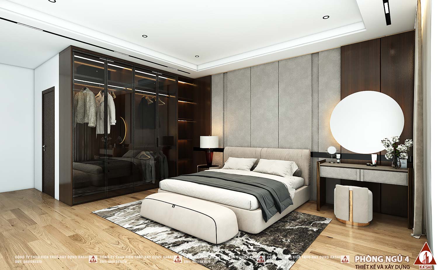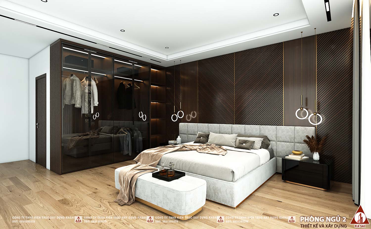 Trong phòng bố trí tủ quần áo tone trầm hài hòa với mặt tường ốp lam gỗ
