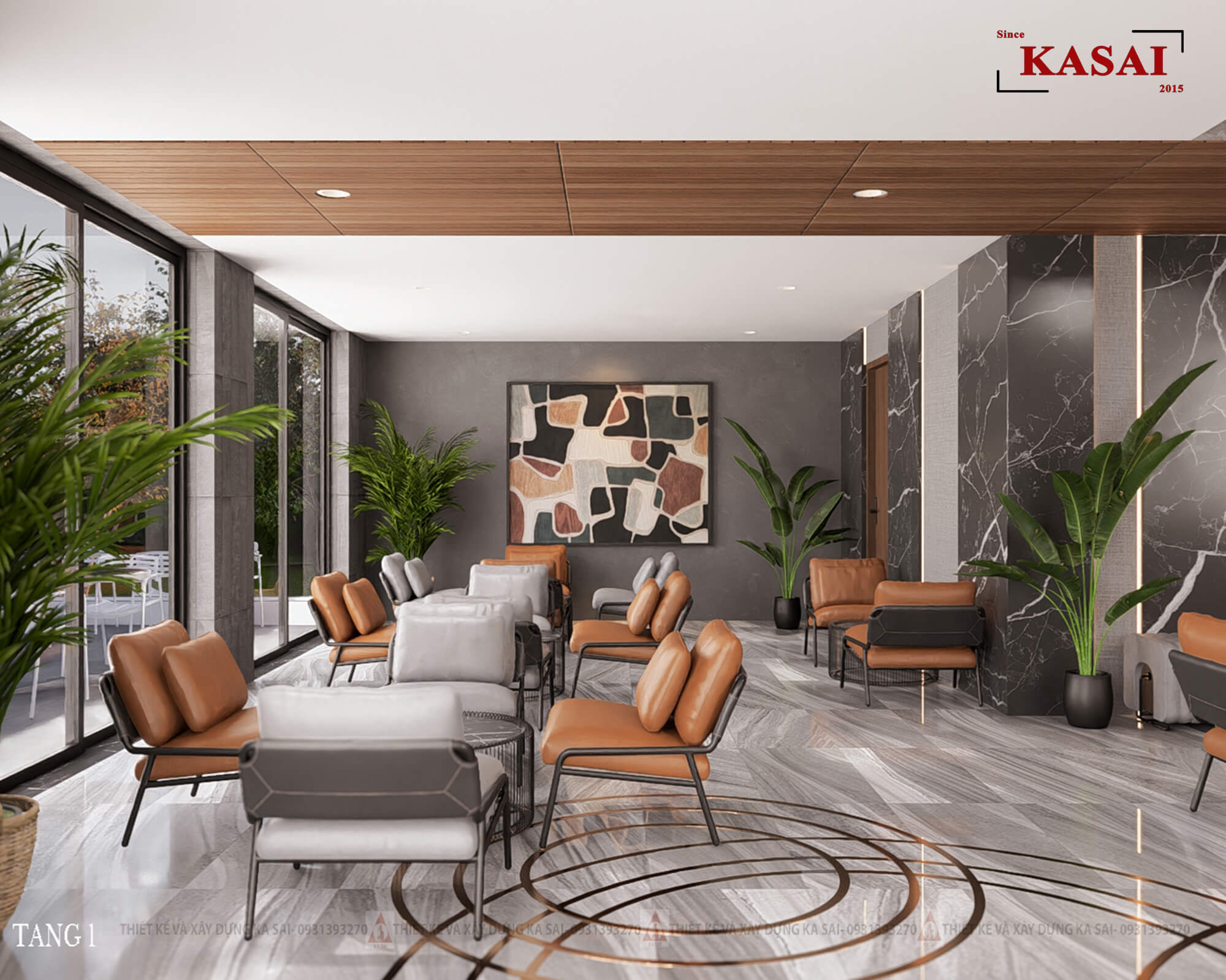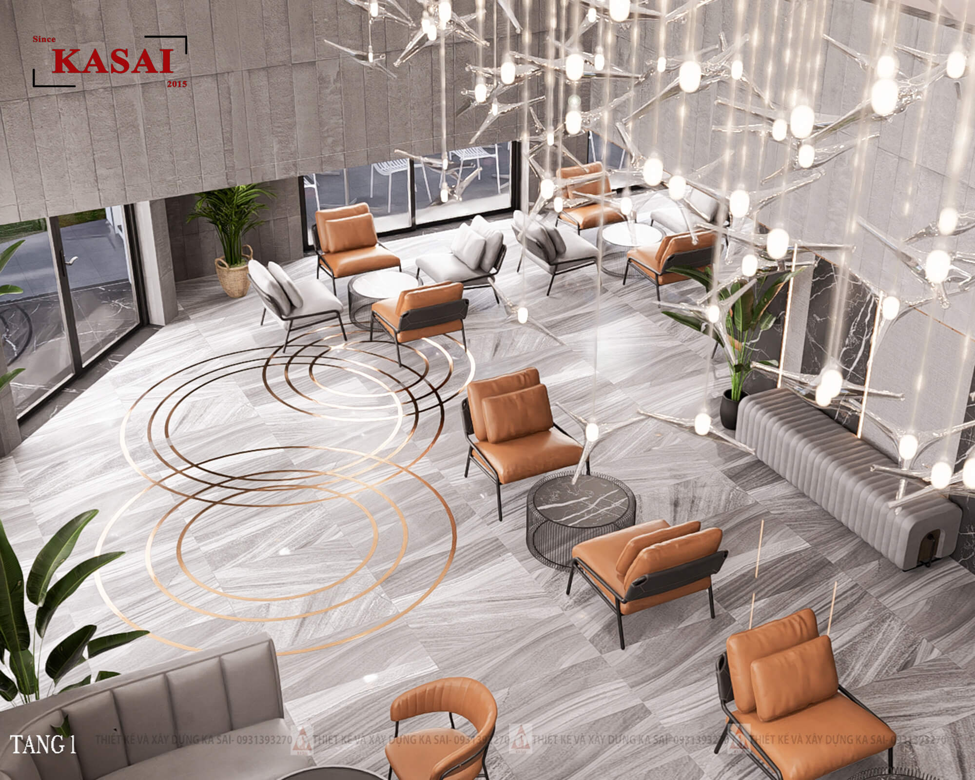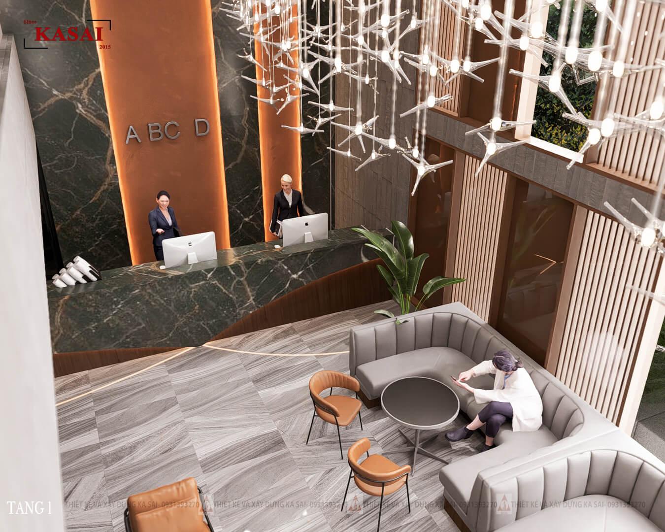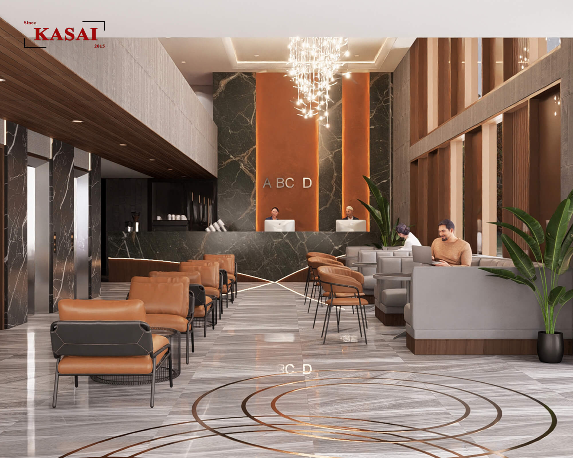 Sảnh chờ lễ tân được thiết kế với những mảng tường ốp đá sang trọng tone màu xám kết hợp cùng đèn âm trần, âm tường tone màu vàng nâu làm không gian trở nên cực ấm cúng. Trong khu vực lễ tân cũng được thiết kế quán cà phê với những ghế sofa, bàn đá sang trọng giúp chủ đầu tư tối ưu doanh thu.