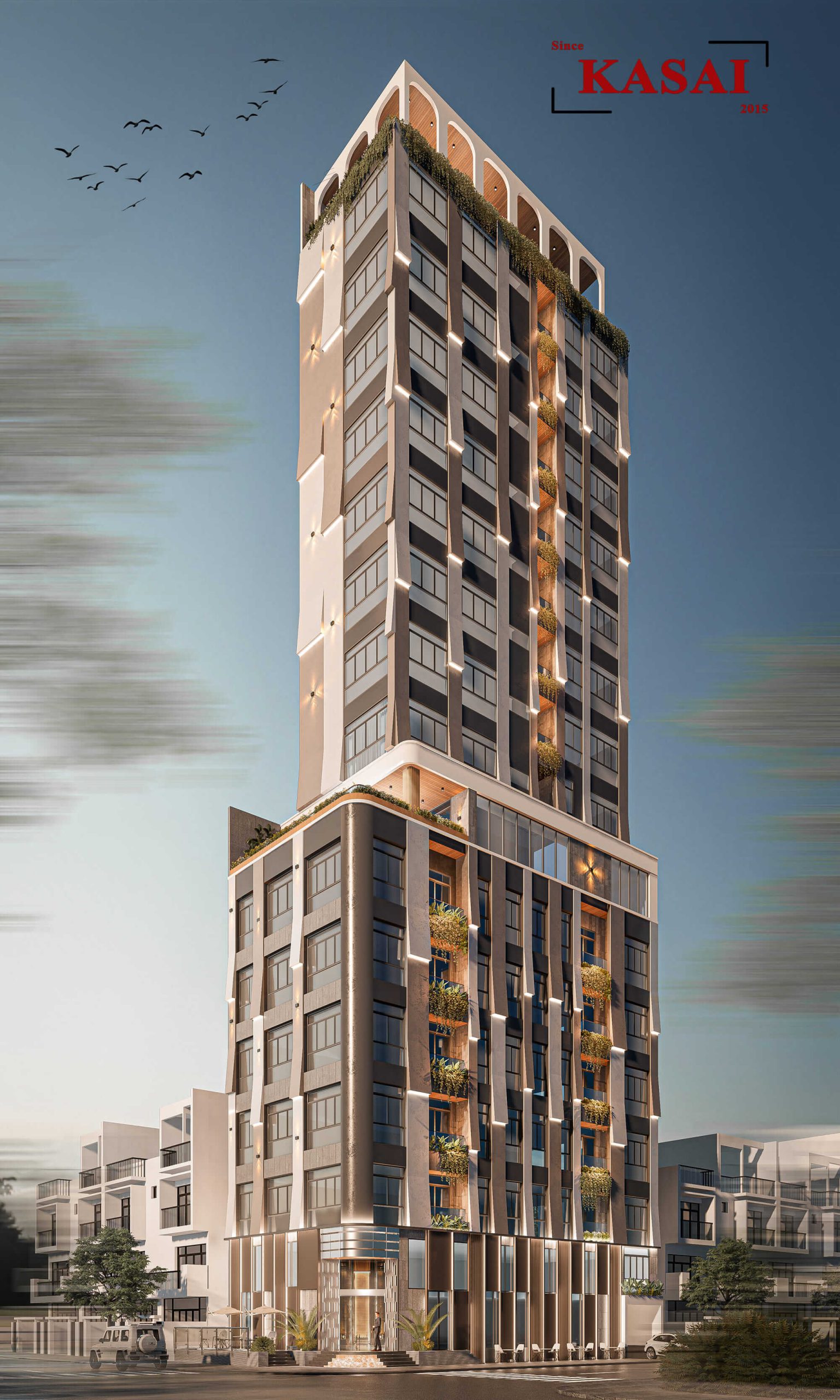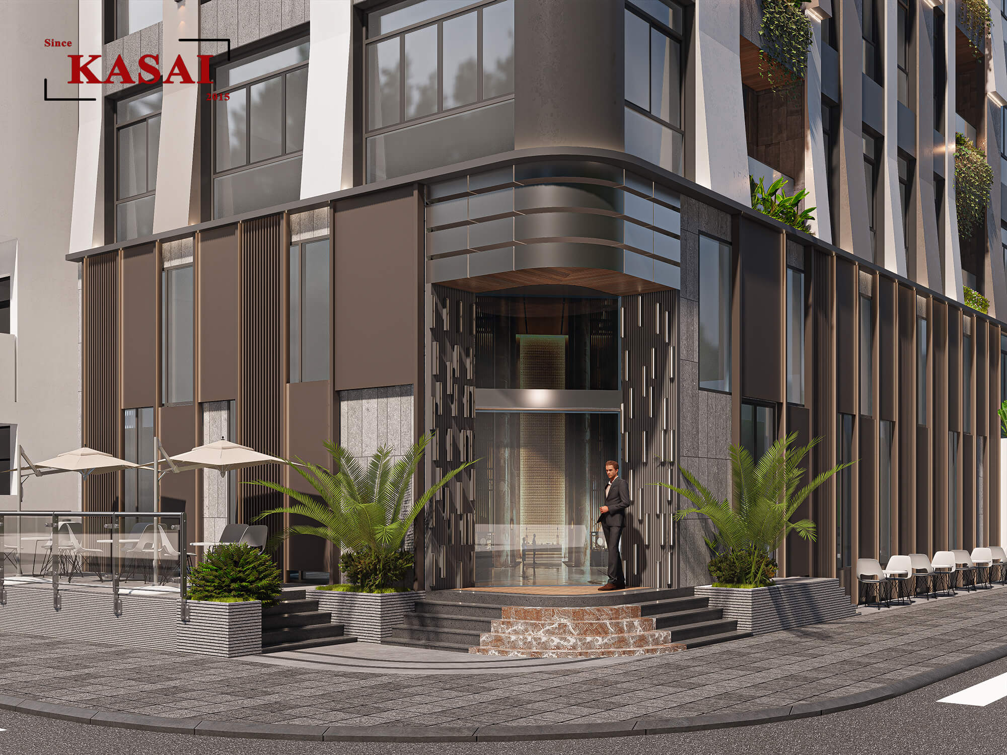 Khắp các tầng kiến trúc sư KASAI đều bố trí những mảng cây xanh mát dịu nơ ban công giúp cho kách sạn trở nên gần gũi hơn tạo cảm giác thư thái. Đặc biệt phần mái bằng thiết thiết kế các dãy vòm cong nhẹ phía dưới tạo điểm nhấn cực kỳ uyển chuyển cho khách sạn. Vừa giảm bớt sự khô cứng của mảng bê tông bên dưới vừa mang đến cảm giác nghệ thuật cho khách sạn. Nhìn từ xa có thể cảm nhận các dãy vòm cong như một vương miện cho khách sạn cao lớn giữa phố.