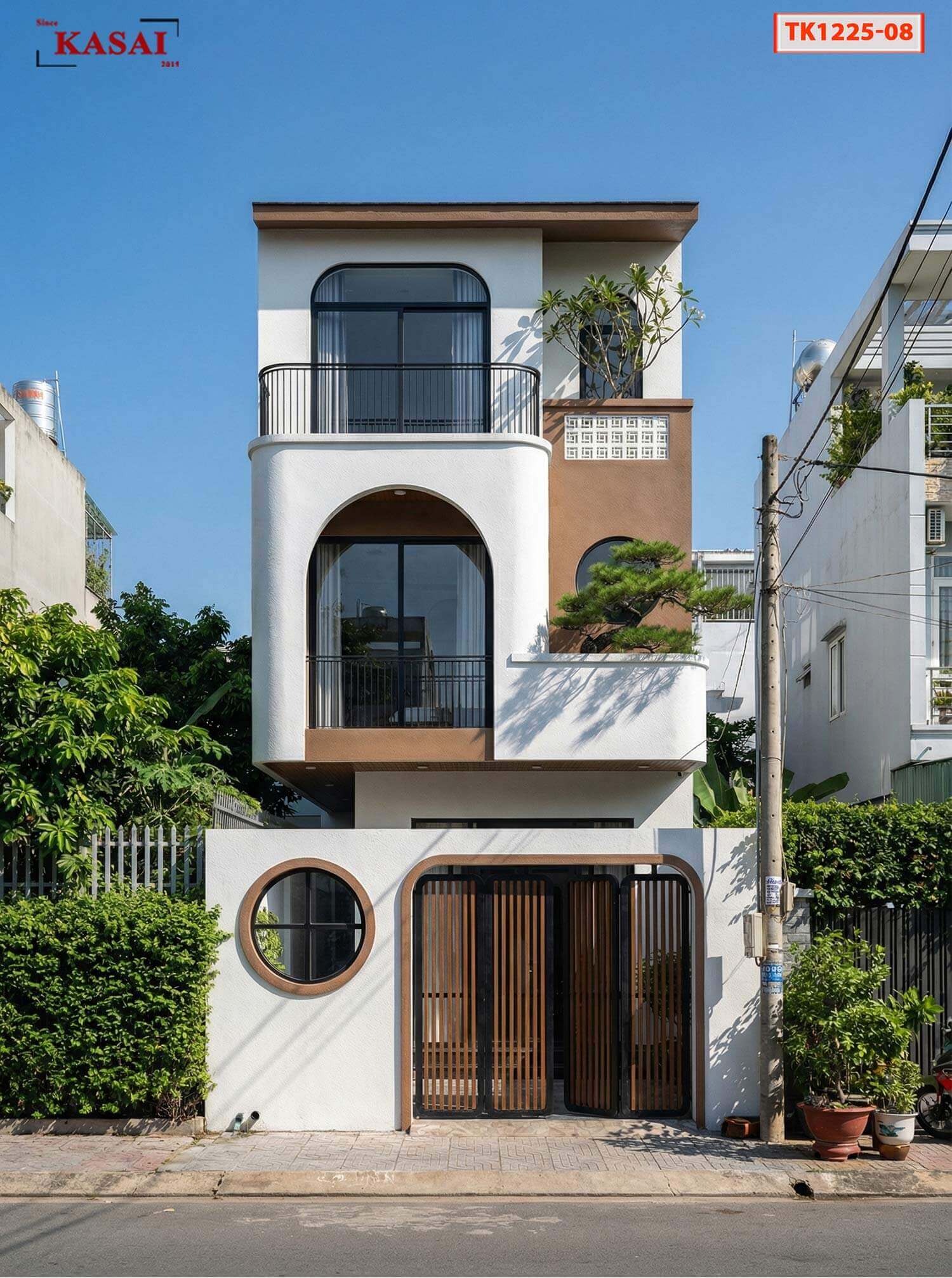 Ngôi nhà hiện lên giữa phố với điểm nhấn mặt tiền vòm cong kết hợp vòng tròn, cùng tone màu trắng, nâu gỗ, đen và cây xanh. Tất cả tạo nên một không gian sống vừa sang trọng lại cực xanh mát giữa phố.
