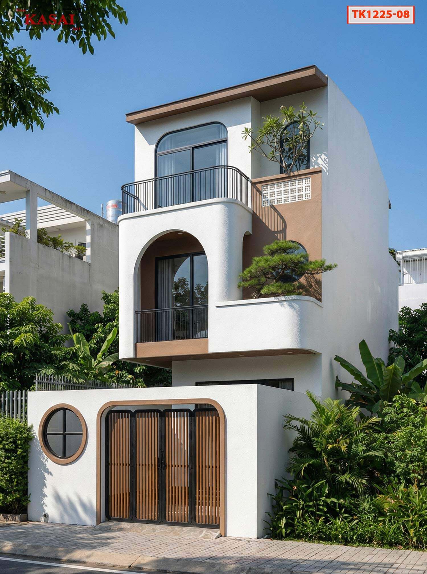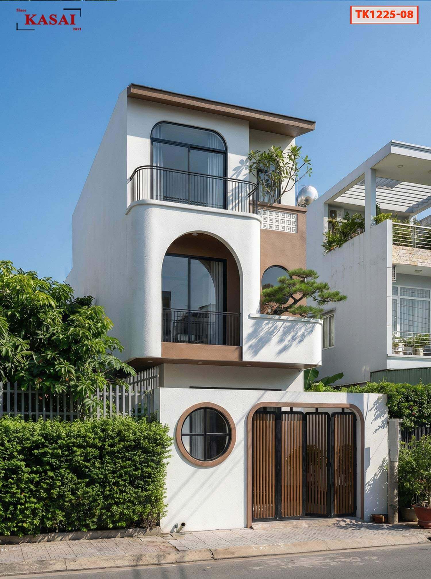 Điểm đắc giá trong thiết kế nhà 3 tầng 5x22m là những ô cửa vòm cong ấn tượng. Tạo nên hiệu ứng mềm mại và giúp tổng thể ngôi nhà thêm nhẹ nhàng và thoáng sáng. Đặc biệt cửa sổ tròn ở cổng mang đến không gian thẩm mỹ và đầy cảm giác thanh lịch. Trong căn nhà này có sự cân bằng hình học giữa những đường cong lớn, cong vừa và cửa tròn.