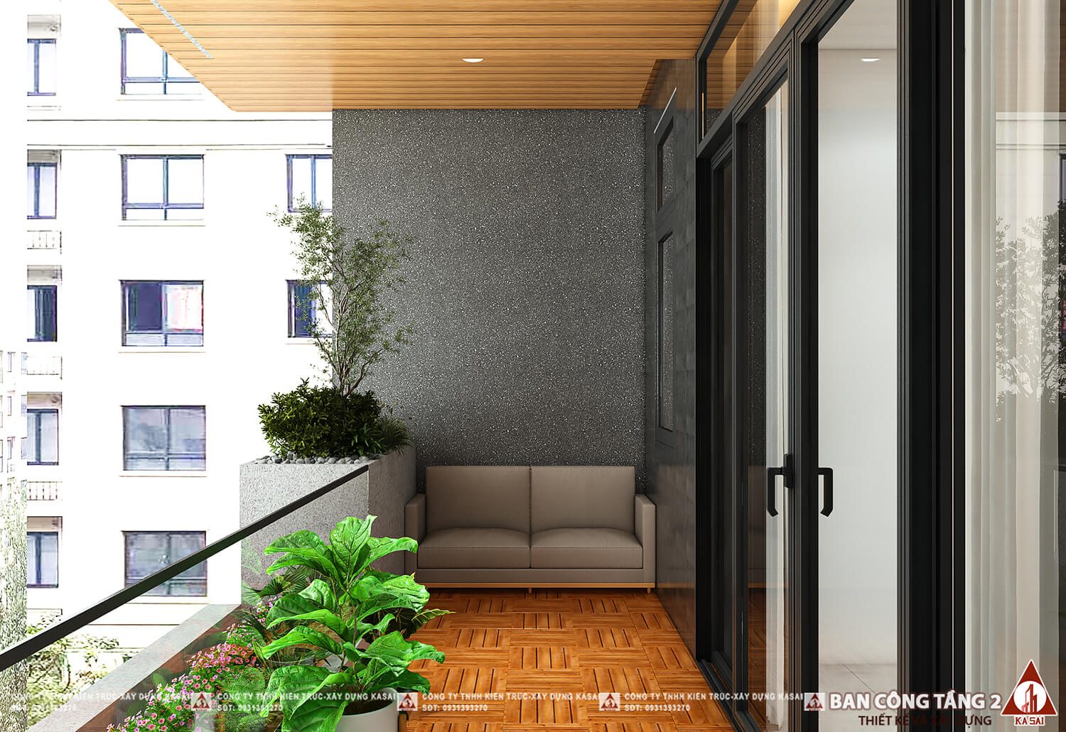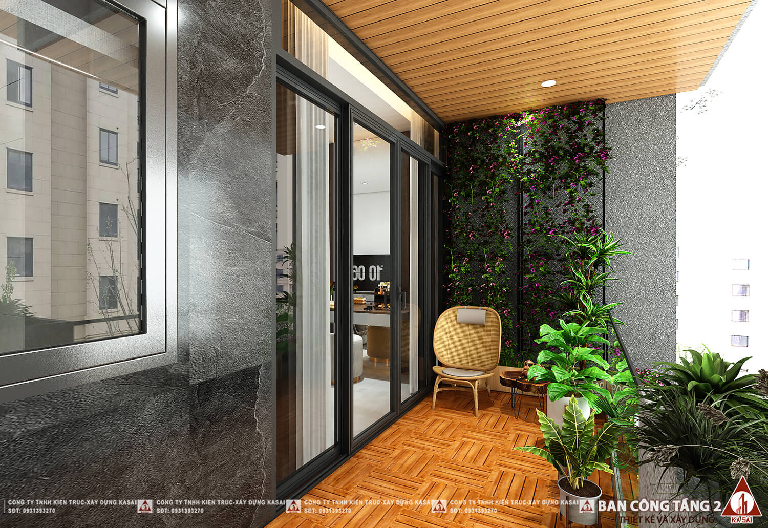 Đặc biệt ban công tầng 2 và tầng 3 được ốp đá gạch ngang tạo điểm nhấn với lan can kính và cây xanh mang đến sự mát mẻ cho ngôi nhà. Để giúp căn nhà thêm phần thẩm mỹ công ty thiết kế nhà Đà Nẵng KASAI đã thiết kế một họa tiết hoa cắt CNC trên phần mái siêu ấn tượng.