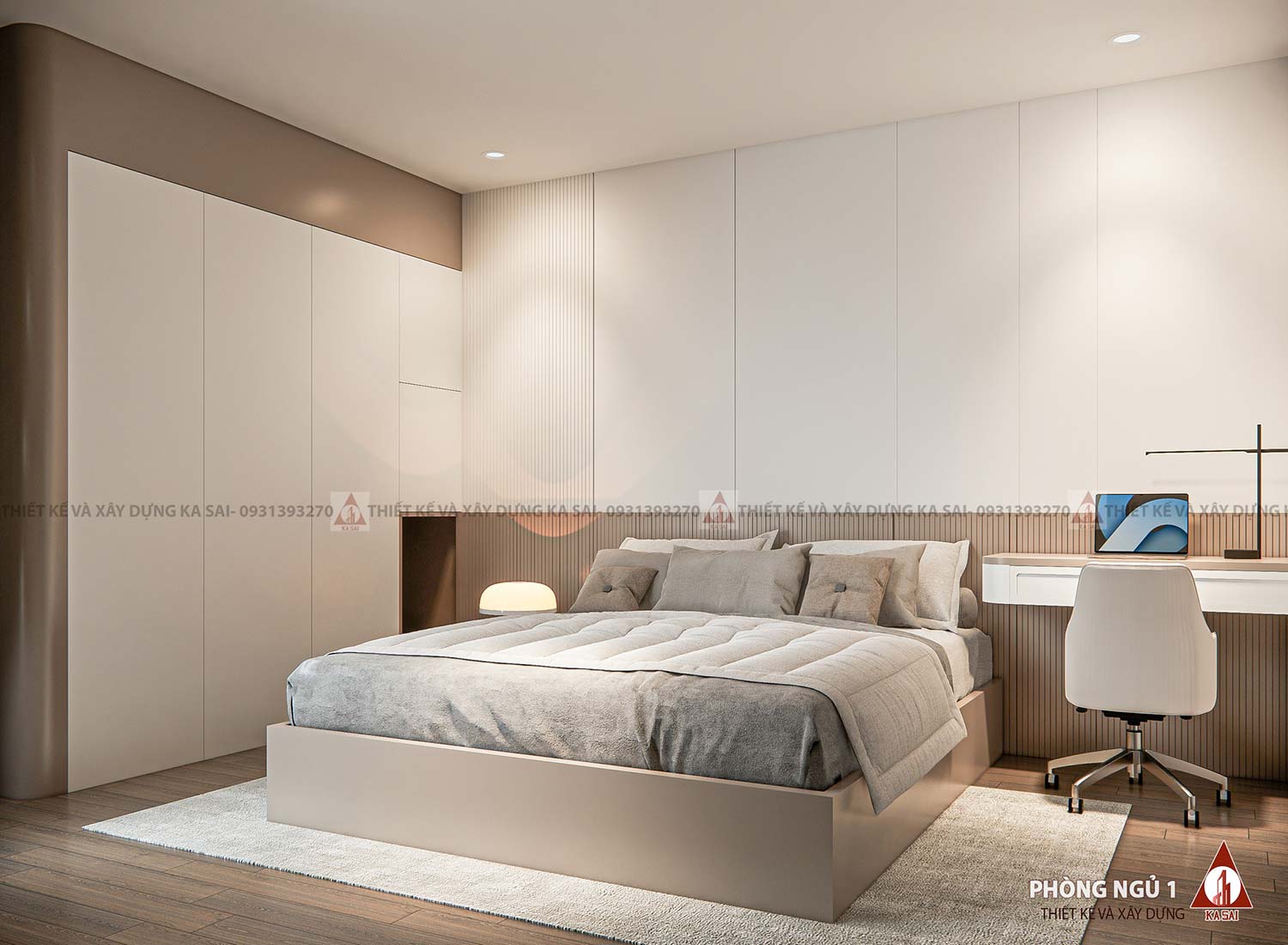 Phòng ngủ được thiết kế hiện đại với mảng tường ốp nhựa