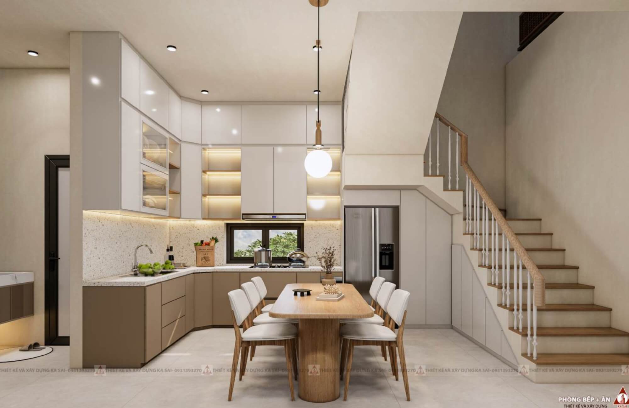 Khu vực bếp đặt cạnh cầu thang với kệ chữ L gọn nhẹ