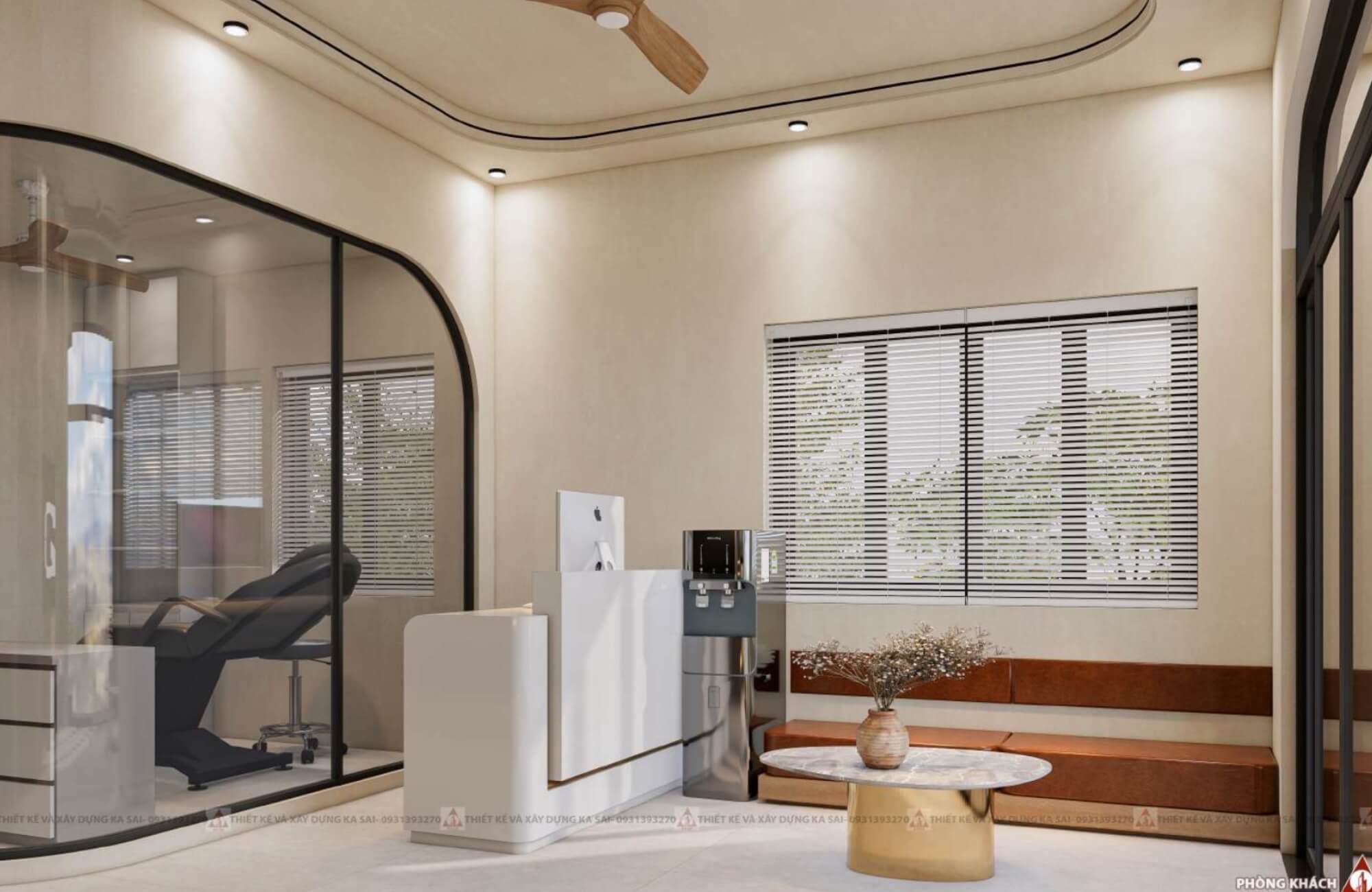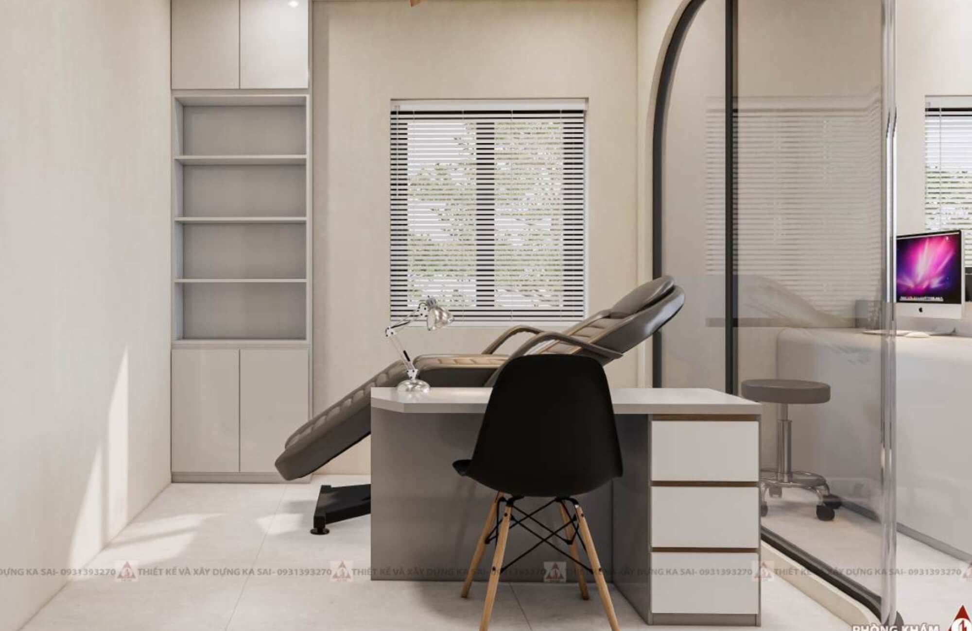 Phòng khám được bố trí rộng rãi với lớp kính bên ngoài và tủ kệ bên trong