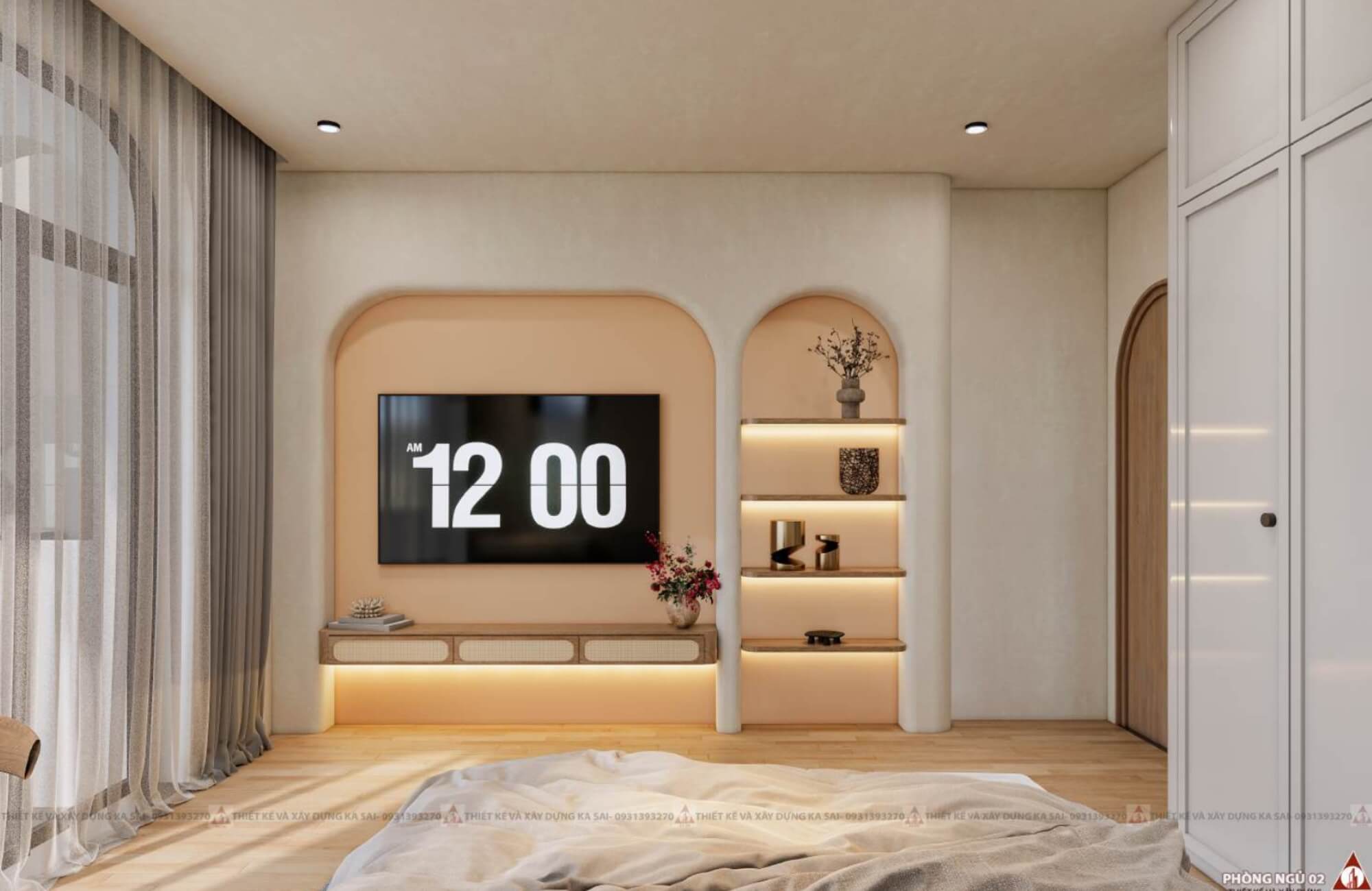 Trong phòng được bố trí tủ kệ tivi như phòng khách siêu sang. Hệ cửa cũng được làm kiểu bo cong