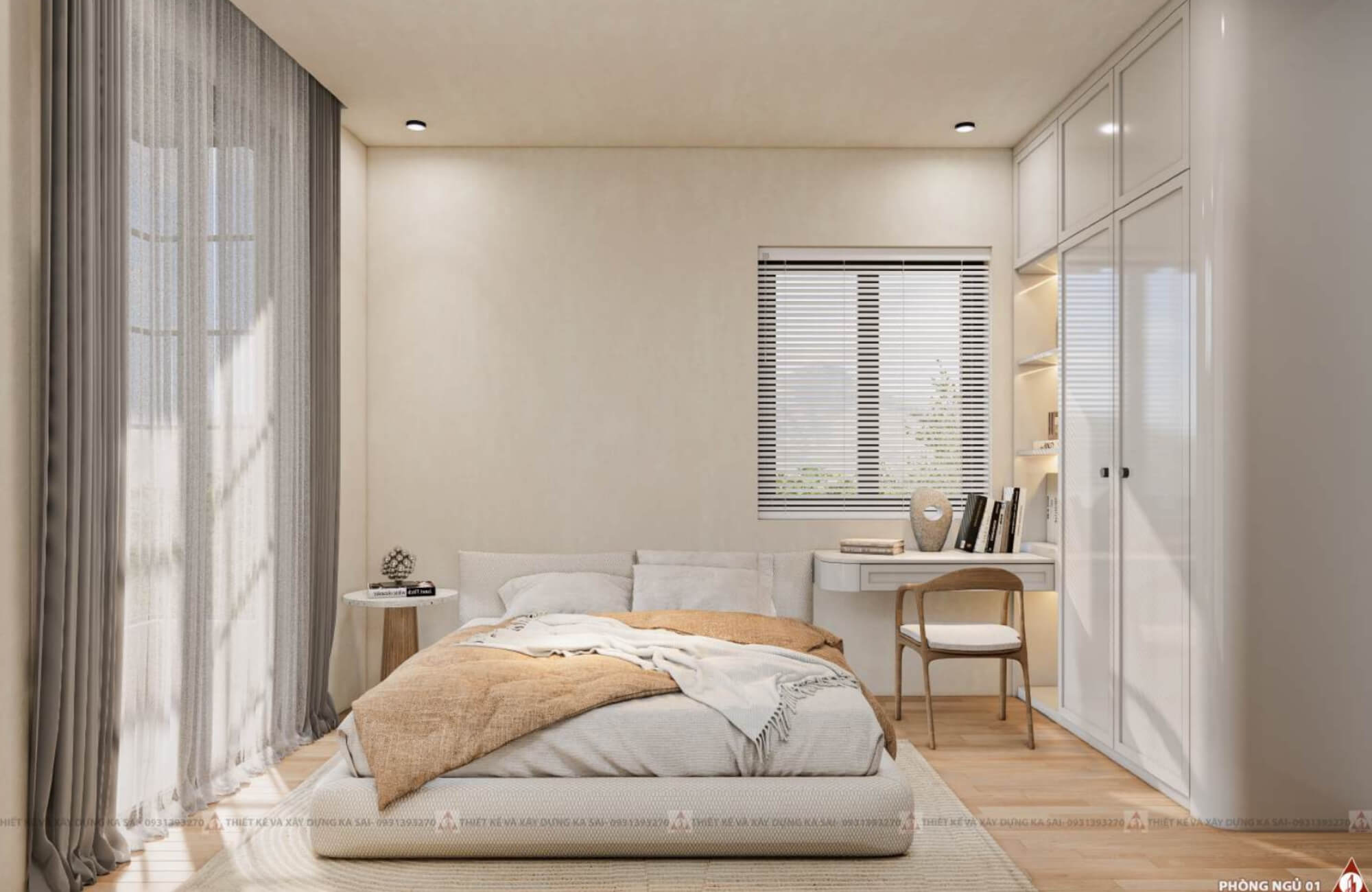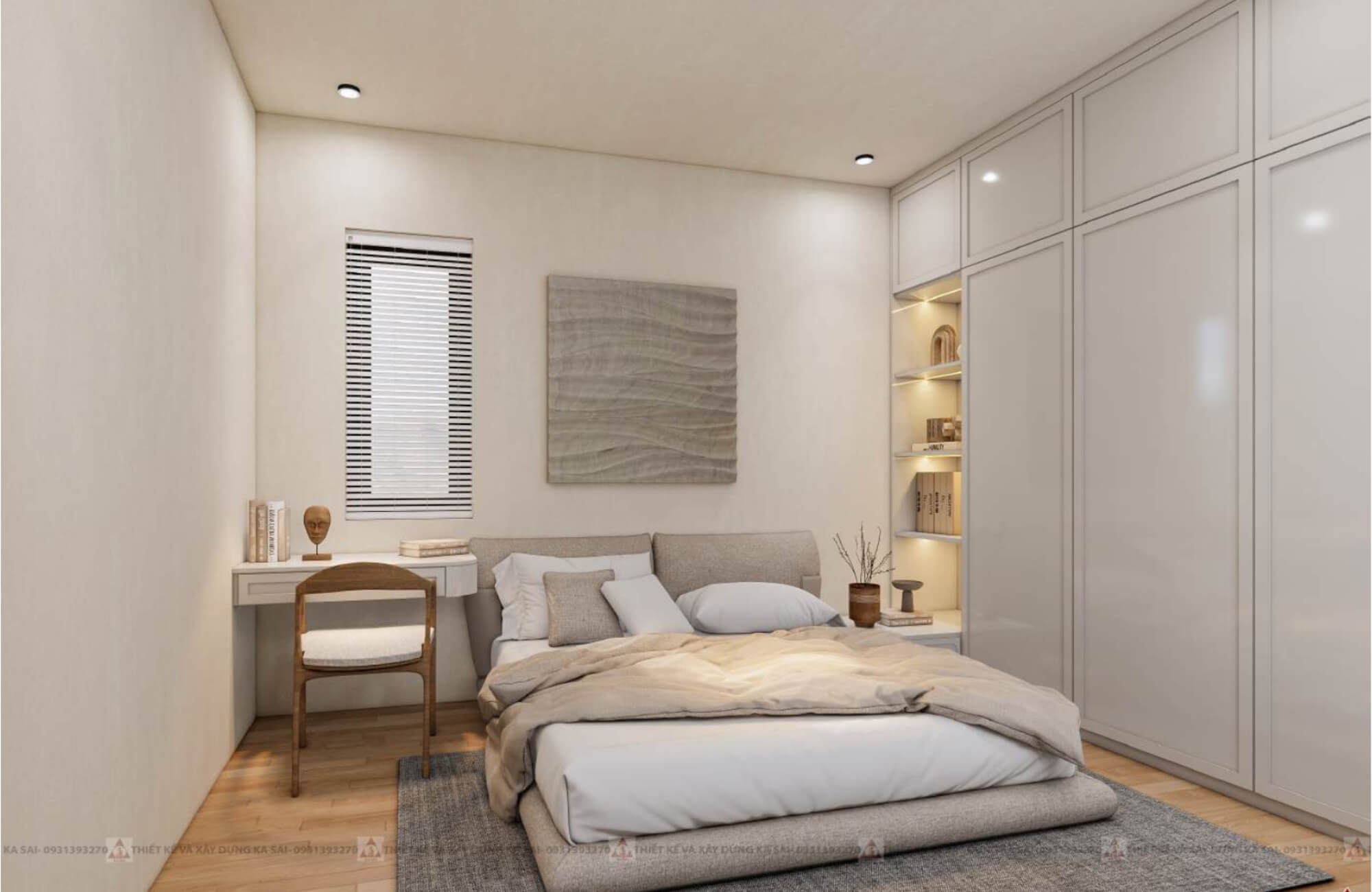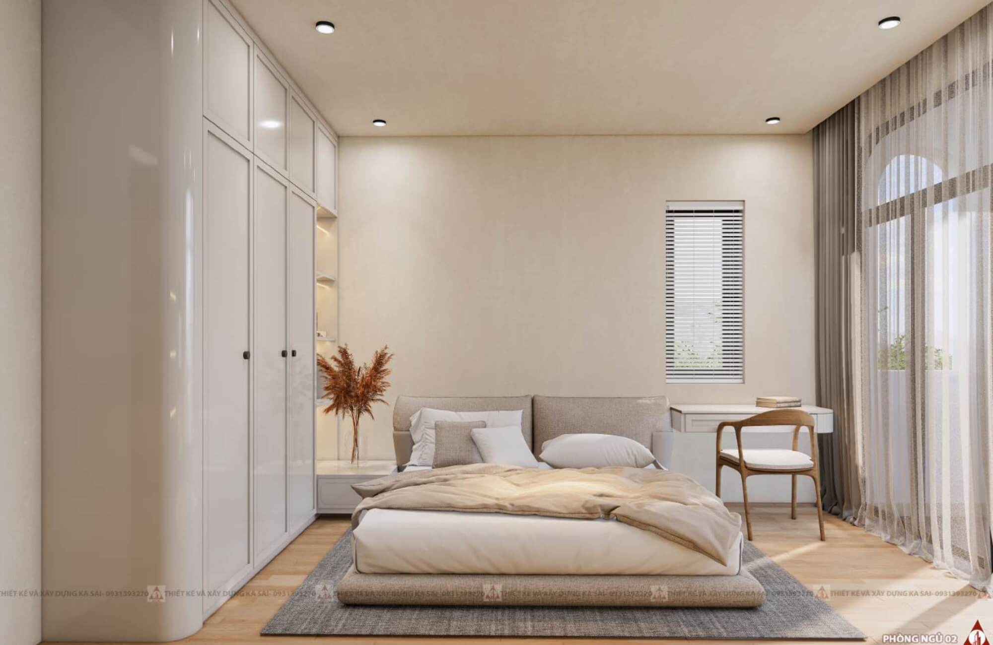 Phòng ngủ tone màu trắng siêu sang trọng với nội thất đa năng tối giản làm không gian siêu rộng rãi
