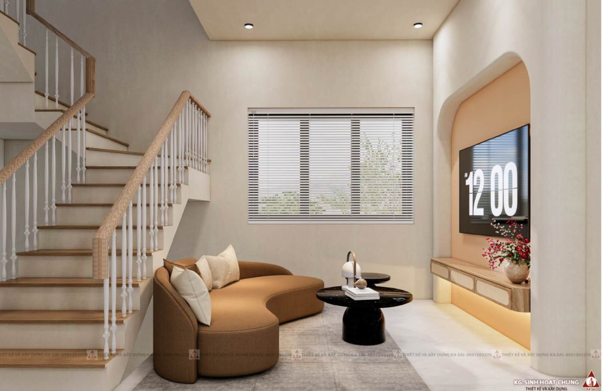 Phòng khách hiện đại với tone màu trắng be và nội thất tối giản